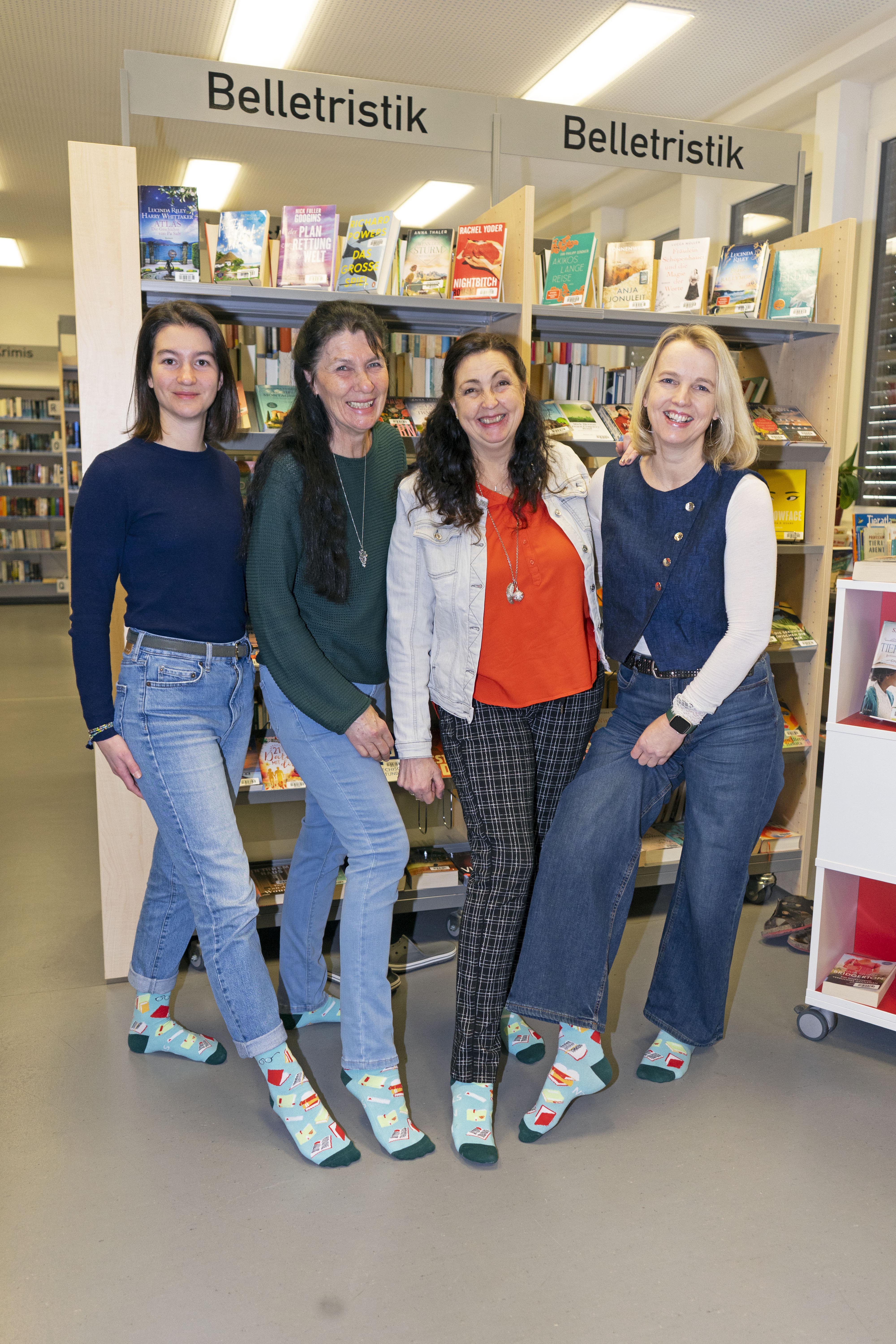Und wenn ihr euch fragt, wer eigentlich all die tollen Veranstaltungen plant, die Regale liebevoll sortiert und mit neuen Ideen die Bücherei bereichert – dann schaut euch doch mal die Menschen hinter den Kulissen an: Leonie, Sabine, Astrid und Corinna.